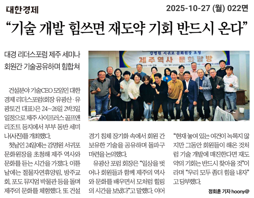 대한경제 리더스포럼(회장 유광산ㆍ유광토건 대표) 세미나 개최